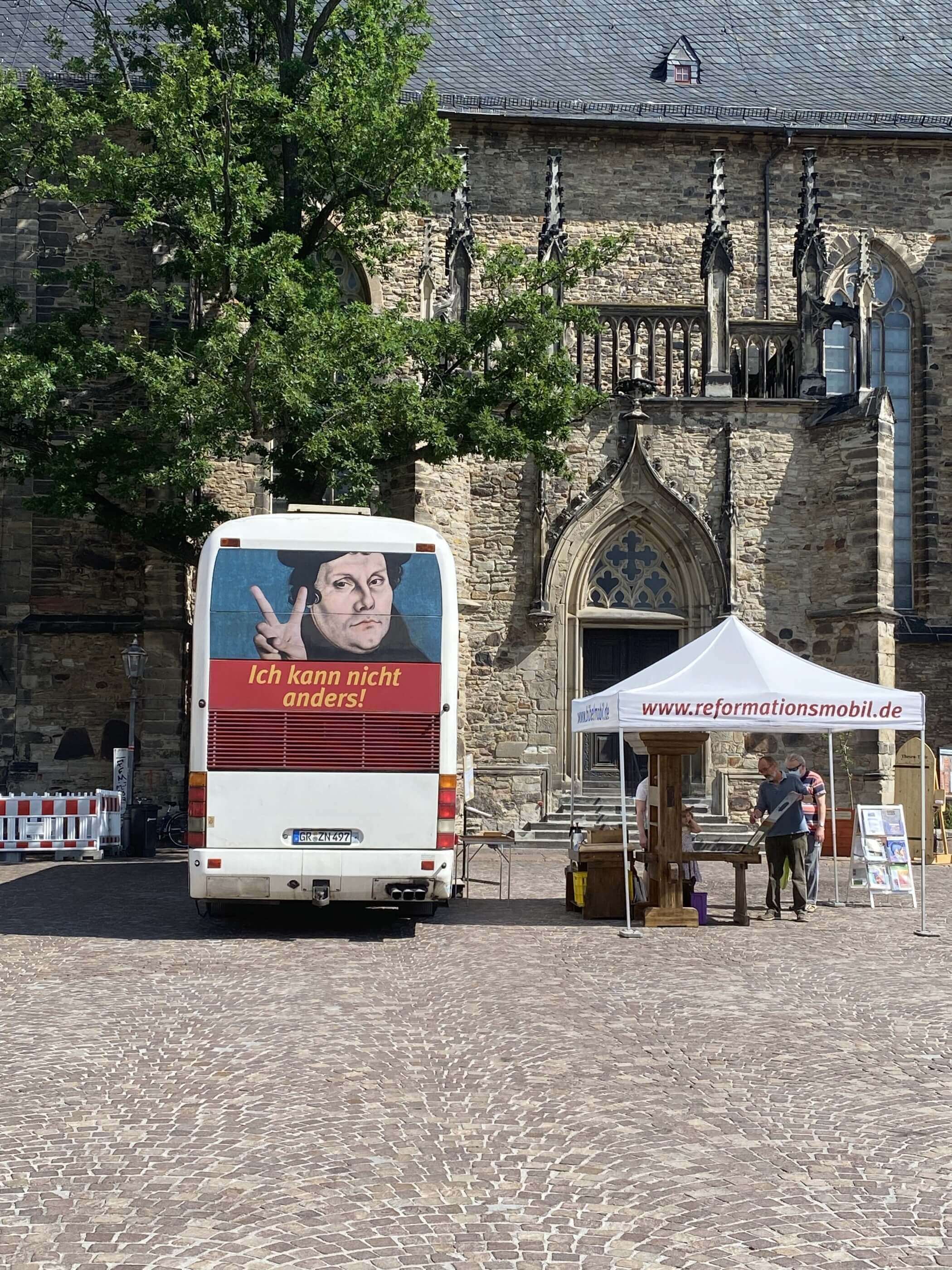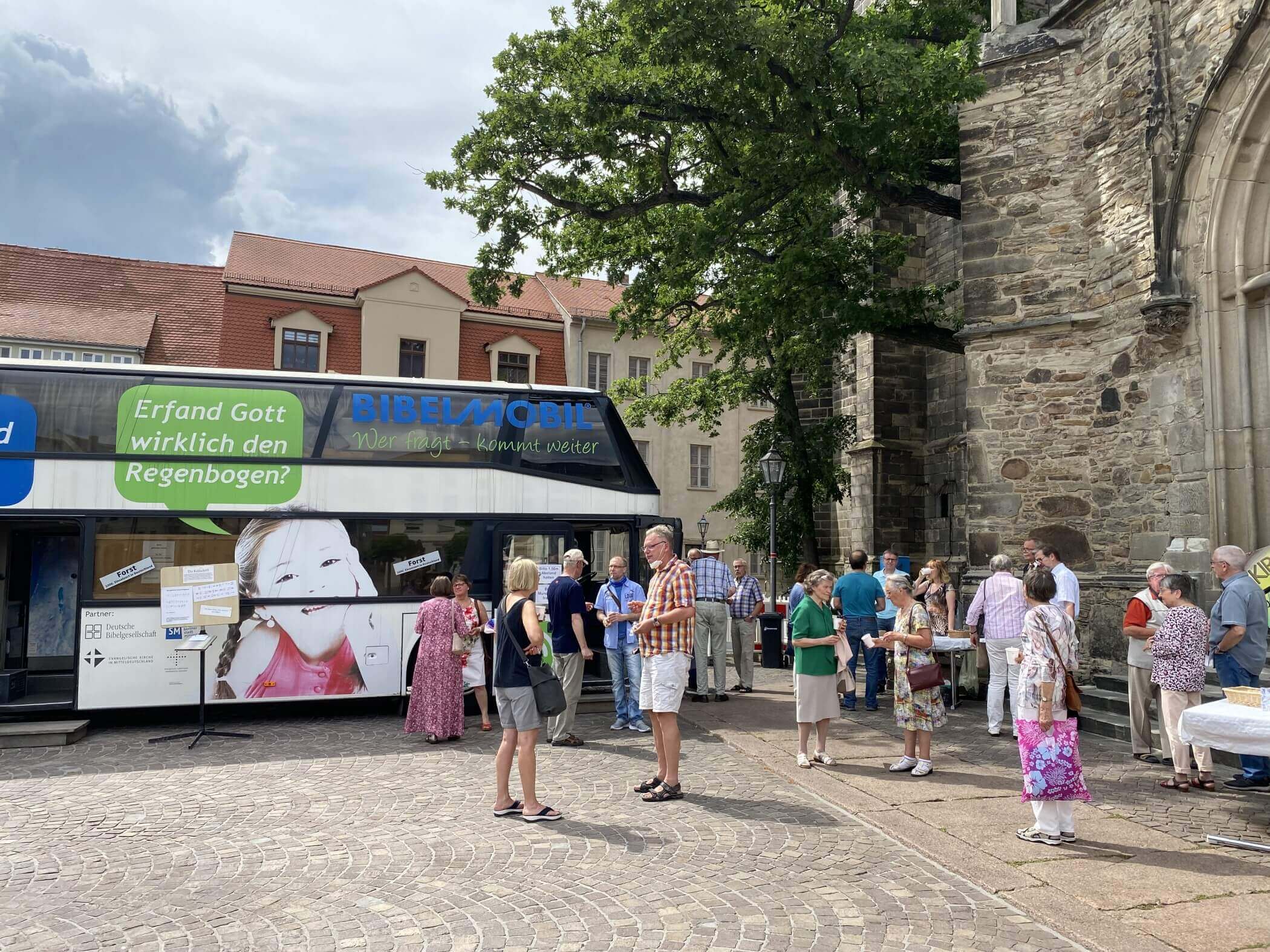 Nach langer Pause und natürlich immer noch unter dem Eindruck und den angezeigten Vorsichtsmaßnahmen konnte am 27.6.2020 wieder ein Gemeindefest in und um St. Jakob stattfinden. Nach dem Gottesdienst stand vor der Kirche bereits das Bibelmobil, ein umgebauter Doppelstockbus, bereit und lud Interessierte zu einer Ausstellung in seinem Inneren und einigen Buchdruckaktionen draußen ein.