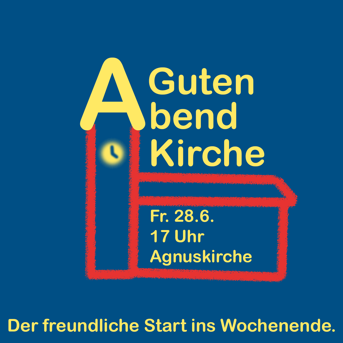 Stell Dir vor, genau dann gibt es eine Einladung: 17 Uhr zur "Guten-Abend-Kirche", dem freundlichen Start ins Wochenende. Wäre das etwas für Dich?